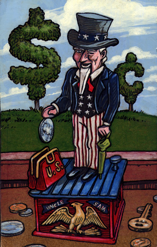 "Uncle Sam Bank" - 7.5" x 12" - ink & acrylic on wood
