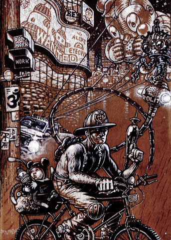 "Sockmonkey Sought for Questioning" - 15" x 21" - ink & acrylic on wood
