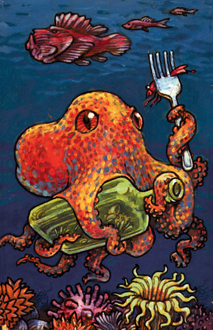 "Cephlapodanticsm" - 7.5" x 12" - ink & acrylic on wood