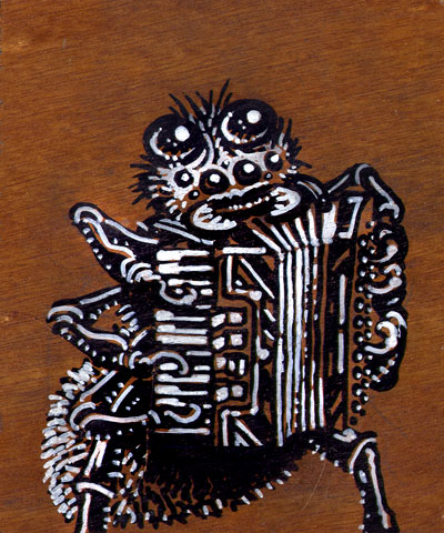 "Acordian Aracnid" - 5" x 6" - ink & acrylic on wood