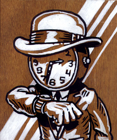 "Clockface Checks His Watch" - 5" x 6" - ink & latex on wood