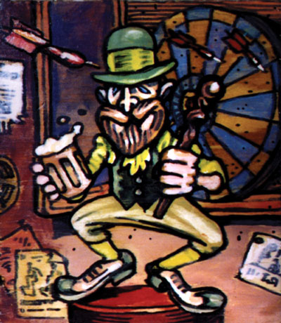 "Darts with Little Man" - 5" x 6" - ink & acrylic on wood