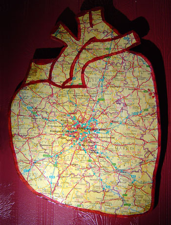 "Paris Heart" - collage, paint on wood cutout - 22" x 17" - (rollover for detail)....................Mary J. Bigelow