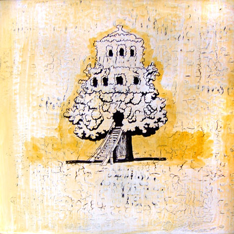 "House Tree " - plaster, glue, shellac, paint on wood - 24" x 24" - (rollover for detail)....................Mary J. Bigelow