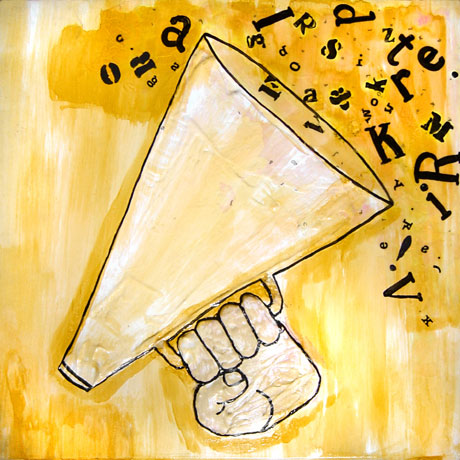 "Free Speech " - plaster, glue, shellac, paint on wood - 24" x 24" - (rollover for detail)....................Mary J. Bigelow...