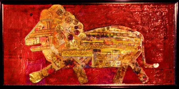 "Magnificat" - cigar boxes, packaging, candy coins, crepe on board - (rollover for detail)....................Mary J. Bigelow