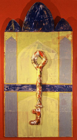 "Open Sesame" - collag, plaster on painted wood cutout - (rollover for detail)....................Mary J. Bigelow