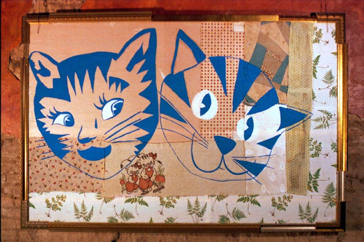 "Don Gato" - paint on fabric, paper collage, on board w/ custom frame - (rollover for detail)....................Mary J. Bigelow